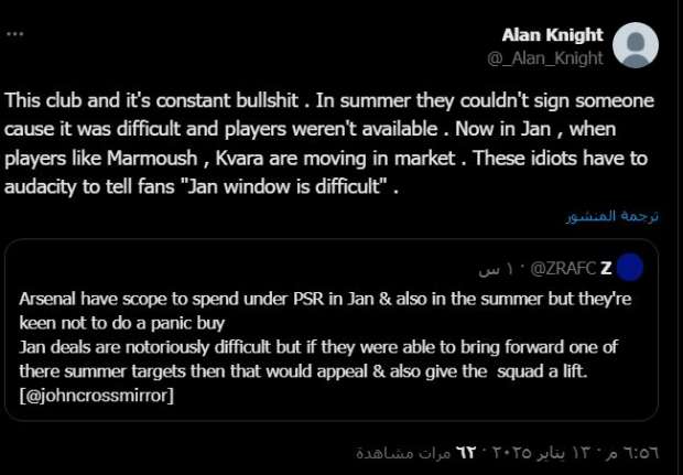 فيما تواصلت المنشادات بتعليق آخر: «هذا النادي وهراءه المستمر، في الصيف لم يتمكنوا من التوقيع مع أي شخص لأن الأمر كان صعبا، ولم يكن اللاعبون متاحين، الآن في يناير، عندما يتواجد لاعبون مثل مرموش وكفارا في السوق، يجب أن تمتلك الإدارة الجرأة ليخبروا المشجعين بأن نافذة يناير صعبة».