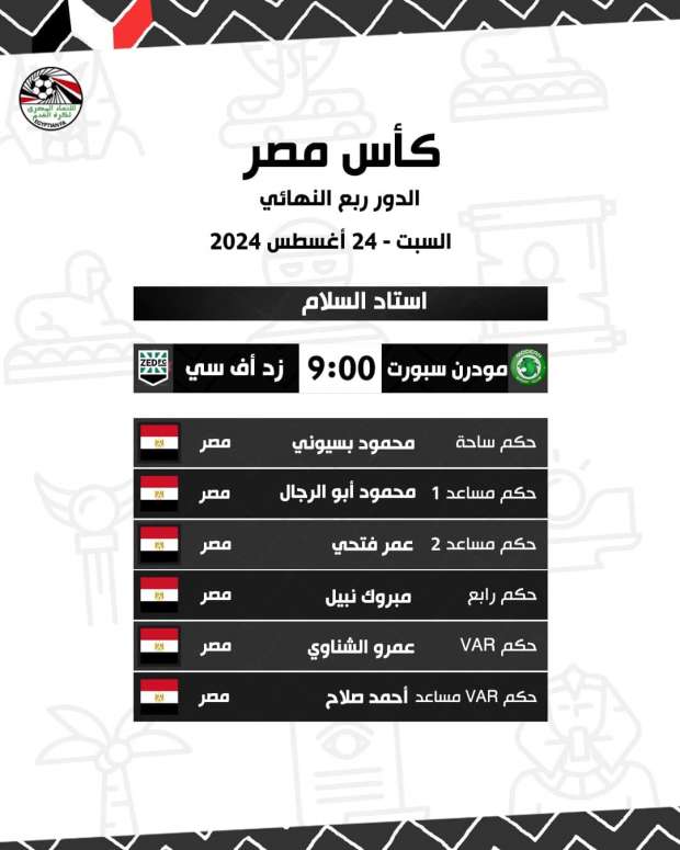 فيما سيدير لقاء مودرن سبورت وزد إف سي المحدد له التاسعة مساء، على استاد السلام، الحكم محمود بسيوني، ويعاونه محمود أبو الرجال وعمر فتحي، ومبروك نبيل حكما رابعا وعمرو الشناوي حكما لتقنية الفيديو ويعاونه أحمد صلاح.