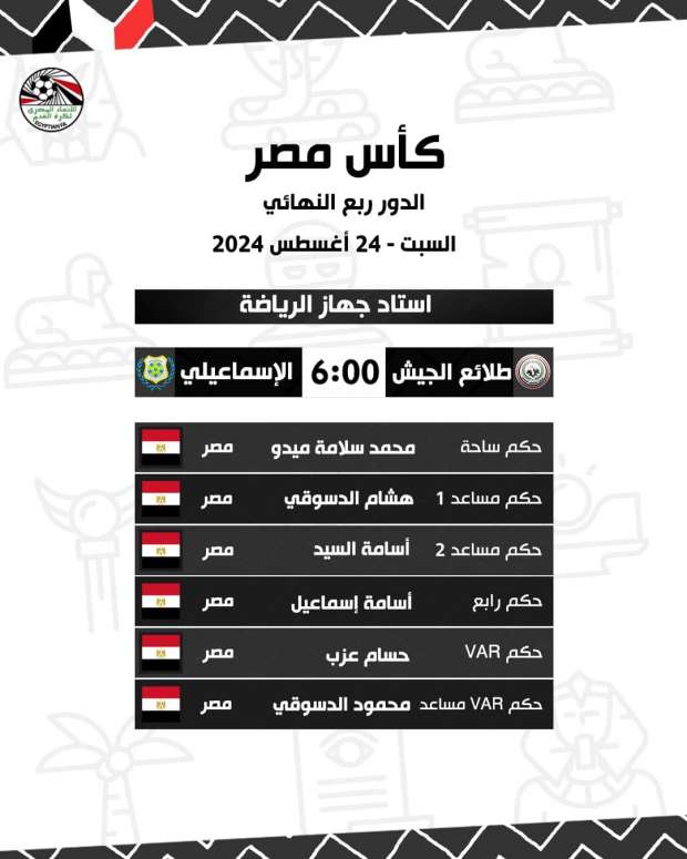 ومن المقرر أن يدير لقاء طلائع الجيش والإسماعيلي المحدد له السادسة مساء على استاد جهاز الرياضة، الحكم محمد سلامة ميدو ويعاونه هشام الدسوقي وأسامة السيد وأسامة إسماعيل حكما رابعا، ويتواجد على تقنية الفيديو الحكم حسام عزب ويعاونه محمود الدسوقي.