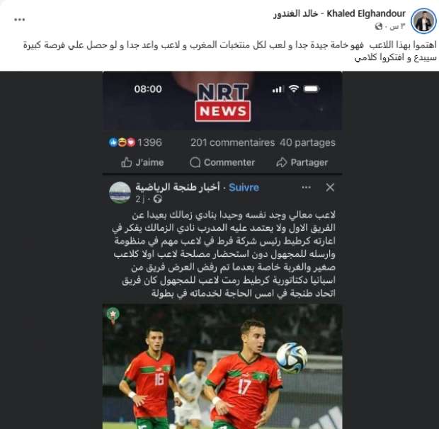 وحرص الغندور على نشر تعليق إحدى الصفحات الرياضية المغربية التابعة لنادي اتحاد طنجة بأن اللاعب مهمل في الزمالك ولم يحصل على فرصته وأن النادي فرط في موهبة كبيرة خاصة بعد استبعاده من مباراتي مودرن سبورت وفاركو.