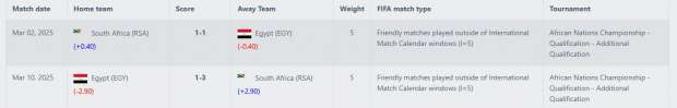 وخسر منتخب مصر للمحلييين بقيادة مدربه وائل رياض، أمام جنوب إفريقيا بنتيجة 3-1 ضمن إياب تصفيات أمم إفريقيا للمحليين، كما كان قد تعادل أيضا مع البافانا بافانا ذهابا 1-1، وهو ما أثر على تصنيف منتخب مصر الأول، بقيادة حسام حسن، إذ أفقده 3.30 نقطة بتصنيف بـ«فيفا» وجعله يتراجع مركزين ليحتل المركز 35 عالميا بدلا من ترتيبه الحالي 33 على مستوى العالم، وذلك قبل مباراتي إثيوبيا وسيراليون بمعسكر مارس الحالي.