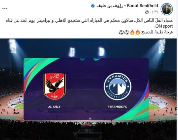 وكتب رؤوف خليف، عبر صفحته بمنصة التواصل الاجتماعي «فيس بوك»: «مساء الفلّ النّاس الكل، سأكون معكم في المباراة التي ستجمع الأهلي وبيراميدز يوم الغد على قناة ON sport.. فرجة طيبة للجميع».