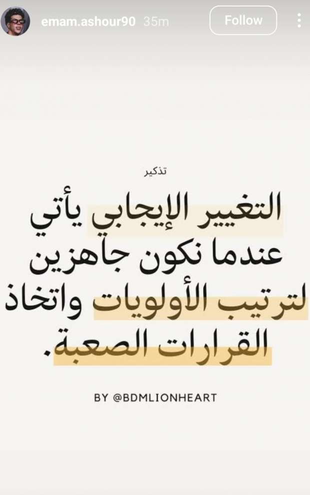 وكتب إمام عاشور، عبر خاصية «الاستوري»، على حسابه الرسمي على موقع التواصل الاجتماعي «إنستجرام»: «التغيير الإيجابي يأتي عندما نكون جاهزين لترتيب الأولويات، واتخاذ القرارات الصعبة».