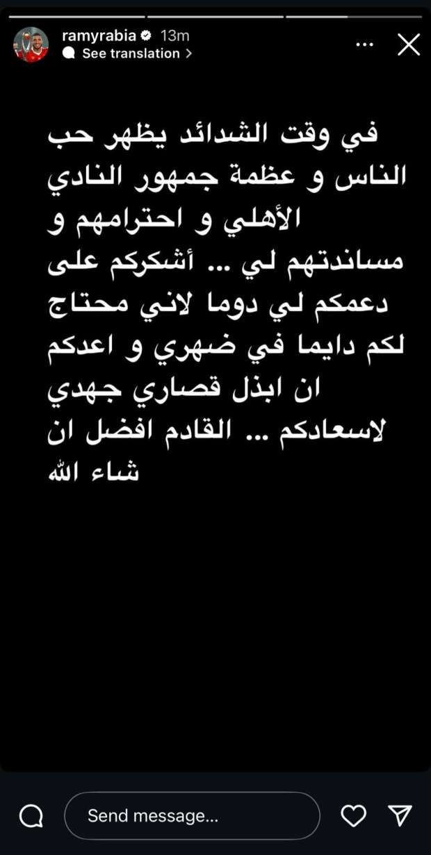 وقال رامي ربيعة من خلال استوري حسابه الشخصي على إنستجرام: «في وقت الشدائد يظهر حب الناس وعظمة جمهور النادي الأهلي واحترامهم ومساندتهم لي.. أشكركم على دعمكم لي دوما لأني محتاج لكم دايما في ضهري وأعدكم أن أبذل قصارى جهدي لإسعادكم.. القادم أفضل إن شاء الله».