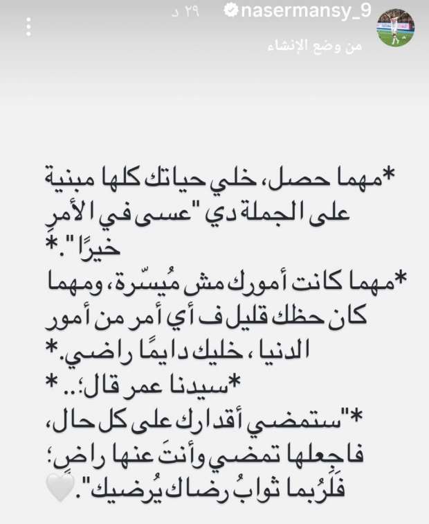 ونشر ناصر منسي عبر حسابه على موقع انستجرام: «مهما حصل خلي حياتك كلها مبنية على الجملة دي “عسي في الأمر خيرا” ، مهما كانت أمورك مش ميسرة ومهما كان حظك قليل في أي أمر من أمور الدنيا، خليك دايما راضي، سيدنا عمر قال، ستمضي أقدارك على كل حال، فاجعلها تمضي وأنت عنها راض، فلربما ثواب رضاك يرضيك».