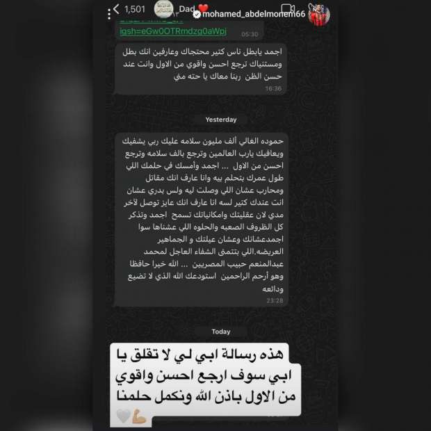 وقام اللاعب بنشر رسالة والده، عبر حسابه الرسمي على موقع تبادل الصور الشهير «إنستجرام»، معلقا عليها بعبارة: «هذه رسالة أبي لي.. لا تقلق يا أبي سوف أرجع أحسن وأقوى من الأول بإذن الله ونكمل حلمنا».