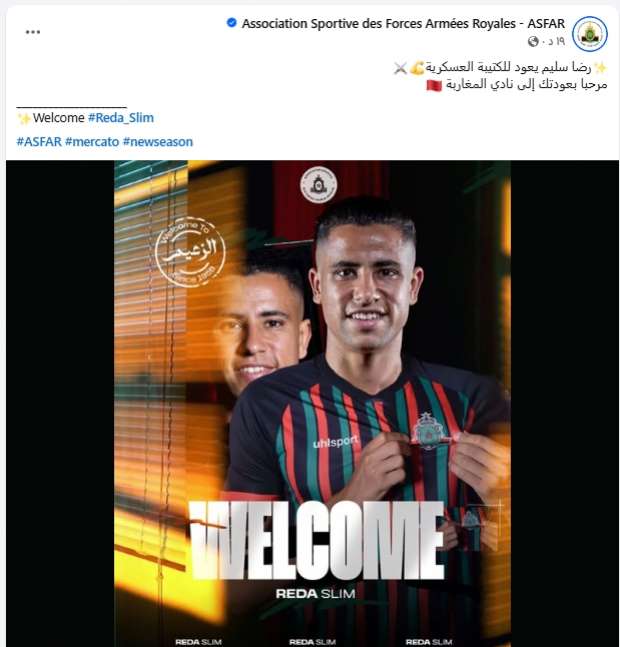 وكتب النادي المغربي عبر صفحته بموقع التواصل الاجتماعي فيس بوك: رضا سليم يعود للكتيبة العسكرية مرحبا بعودتك إلى نادي المغاربة.