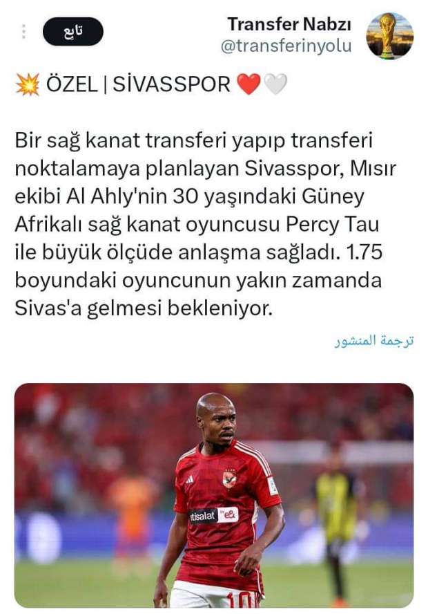 ووفقًا للتقارير تركية، فإن نادي سيفاس سبور التركي، قد توصل لاتفاق مع أفضل لاعب في قارة إفريقيا، في الموسم الماضي بيرسي تاو، للتعاقد معه خلال الصيف الجاري.