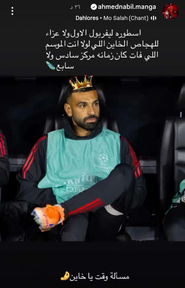 ونشر أحمد نبيل مانجا عبر حسابه على ستوري انستجرام: أسطورة ليفربول الأول ولا عزاء للهجاص الخاين اللي لولا أنت الموسم اللي فات كان زمان الفريق مركز سادس أو سابع مسألة وقت وسترحل.