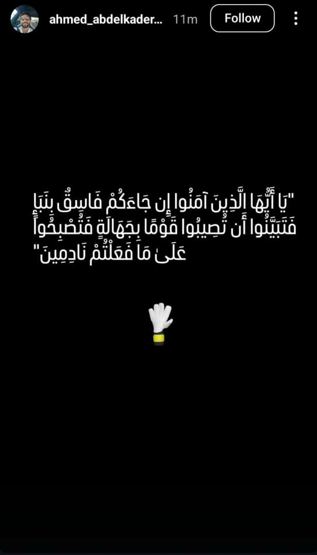 ونشر «عبدالقادر»، آية قرآنية، عبر خاصية «الاستوري» على حسابه الرسمي، بموقع تبادل الصور الشهير «إنستجرام»، جاءت كالتالي: «ياأيها الذين آمنوا إن جاءكم فاسق بنبإ فتبينوا أن تصيبوا قوما بجهالة فتصبحوا على ما فعلتم نادمين».