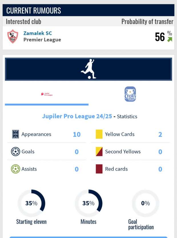 وذكر الموقع أن نسبة انتقال زين الدين بلعيد للزمالك خلال فترة الانتقالات الشتوية تصل إلى 56%، مع توقعات بزيادة النسبة في الأيام المقبلة.