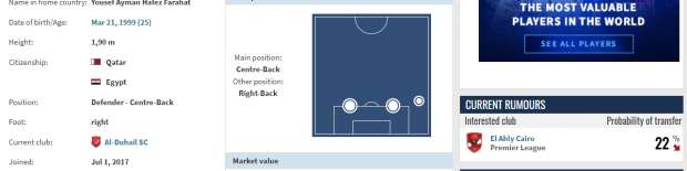 فيما أكد الموقع العالمي بأن هناك نسبة 1% ارتفاع في احتمالية انتقال يوسف أيمن مدافع فريق الدحيل القطري في ظل الحديث عن إمكانية رحيل محمد عبدالمنعم.