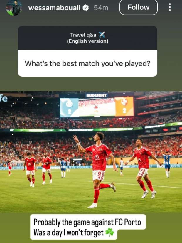 ونشر «أبو علي»، في خاصية «ستوري»، عبر حسابه الرسمي على موقع تبادل الصور الشهير «إنستجرام»، صورة له من مباراة الأهلي وبورتو البرتغالي في الجولة الثالثة من النسخة الأخيرة لبطولة كأس العالم للأندية، مصحوبا برده على أحد الأسئلة الموجهة له عن أفضل مباراة لعبها، حيث جاء رده بأن مباراة الأهلي وبورتو هي الأفضل بالنسبة له.