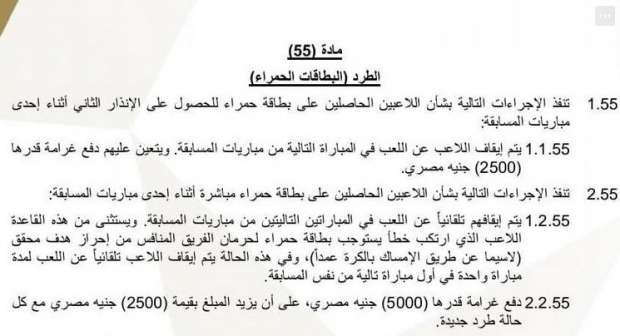 1- يتم إيقاف اللاعب الحاصل على بطاقة حمراء عن اللعب في المباراتين التاليتين من مباريات المسابقة، ويستثنى من هذه القاعدة اللاعب الذي ارتكب خطأ يستوجب بطاقة حمراء لحرمان الفريق المنافس من تسجيل هدف محقق (لا سيما عن طريق الإمساك بالكرة عمدًا)، وفي هذه الحالة يتم إيقاف اللاعب تلقائيًا عن اللعب لمدة مباراة واحدة في أول مباراة تالية من نفس المسابقة.