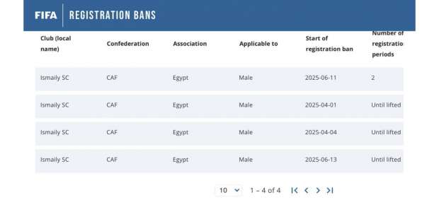وطبقًا لأداة فيفا الرقمية للأندية الممنوعة من القيد، فإن اسم الإسماعيلي ظهر في قضية جديدة اليوم الجمعة، عقوبتها إيقاف القيد لأجل غير مسمى، لتكون القضية الرابعة للفريق.