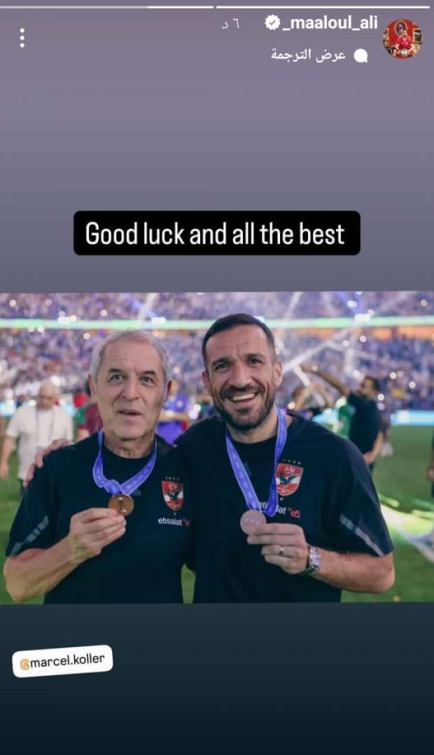 ونشر علي معلول صورة مارسيل كولر في تدريب الأهلي، وعلق عليها: «حظ سعيد وبالتوفيق لك»، في رسالة خاصة من اللاعب التونسي للمدرب السويسري.