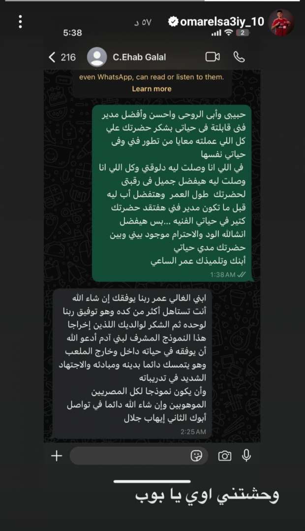 نشر عمر الساعي المنضم حديثًا لصفوف النادي الأهلي خلال فترة الانتقالات الصيفية الجارية، قادمًا من الإسماعيلي، محادثة سابقة بينه وبين الراحل إيهاب جلال المدير الفني للدراويش.