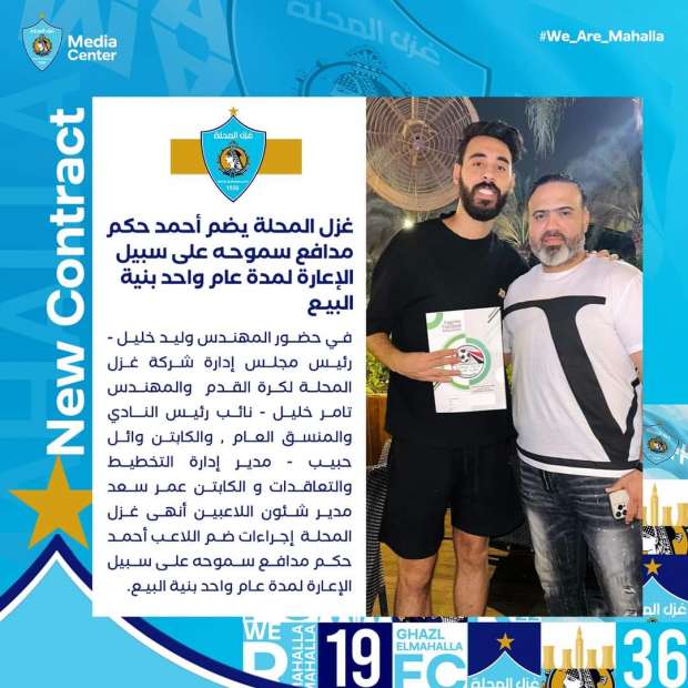 وجاء نص البيان الرسمي، الذي أصدره النادي، كالتالي: «في حضور المهندس وليد خليل، رئيس مجلس إدارة شركة غزل المحلة لكرة القدم، والمهندس تامر خليل، نائب رئيس النادي، المنسق العام، والكابتن وائل حبيب، مدير إدارة التخطيط والتعاقدات، والكابتن عمر سعد، مدير شؤون اللاعبين، أنهى غزل المحلة إجراءات ضم اللاعب أحمد حكم، مدافع سموحة، على سبيل الإعـارة لمدة عام واحد، بنية البيع».