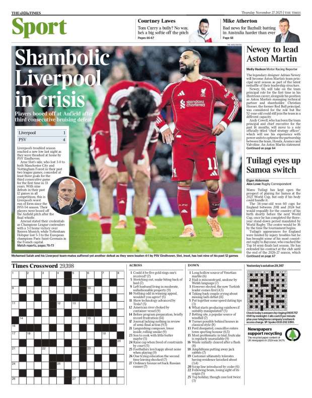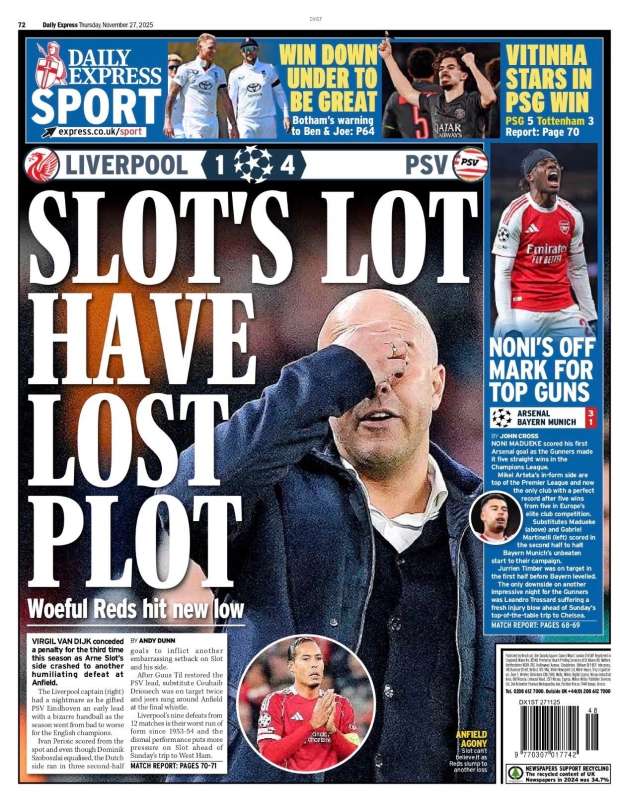 وجهت الصحف العالمية، رسائل قاسية لفريق المدرب الهولندي أرني سلوت، عقب السقوط المدوي للفريق أمام أيندهوفن، في اللقاء الذي جمع الفريقين، ضمن مباريات مسابقة دوري أبطال أوروبا، والتي أقيمت على ملعب الإنفيلد.