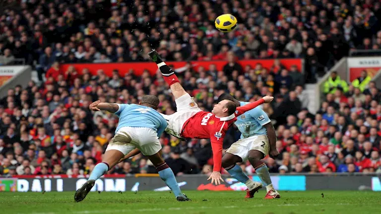 وبعد أن اصطدمت كرة ناني العرضية بأرض الملعب، عدل روني مساره وقابلها بركلة خلفية سكنت الزاوية العليا لمرمى حارس مرمى مانشستر سيتي جو هارت.