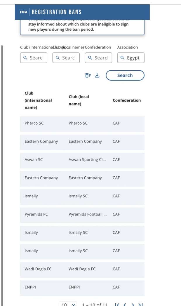 وكشف «فيفا» عبر الأداة عن استمرار إيقاف القيد على أندية بيراميدز، فاركو، أسوان، وادي دجلة، الإسماعيلي (المُعاقَب في ثلاث قضايا)، إيسترن كومباني، وإنبي (قضيتان لكل منهما). أما بيراميدز، فاركو، أسوان، ووادي دجلة، فلكل منهم قضية واحدة.