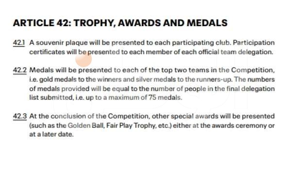 وأوضح البند الثاني في المادة 42، أنه سيتم تقديم الميداليات للأصحاب المركزين الأول والثاني، أي الميداليات الذهبية للفائزين والميداليات الفضية للوصيف.