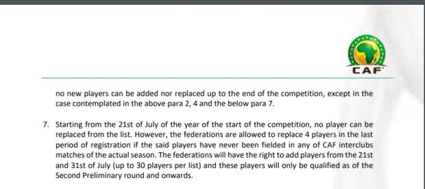 – اعتبارًا من توقيت بدء المسابقة، لا يجوز استبدال أي لاعب من القائمة. ومع ذلك، يُسمح للاتحادات باستبدال 4 لاعبين في آخر فترة تسجيل إذا لم يسبق لهم المشاركة في أي من مباريات أندية CAF للموسم الفعلي وبالفعل يوسف سيد عبدالحفيظ وأحمد عابدين لم يشاركوا في مباراة فريقهم أمام جورماهيا الكيني ليحق للأهلي استبدالهم بشكل طبيعي.