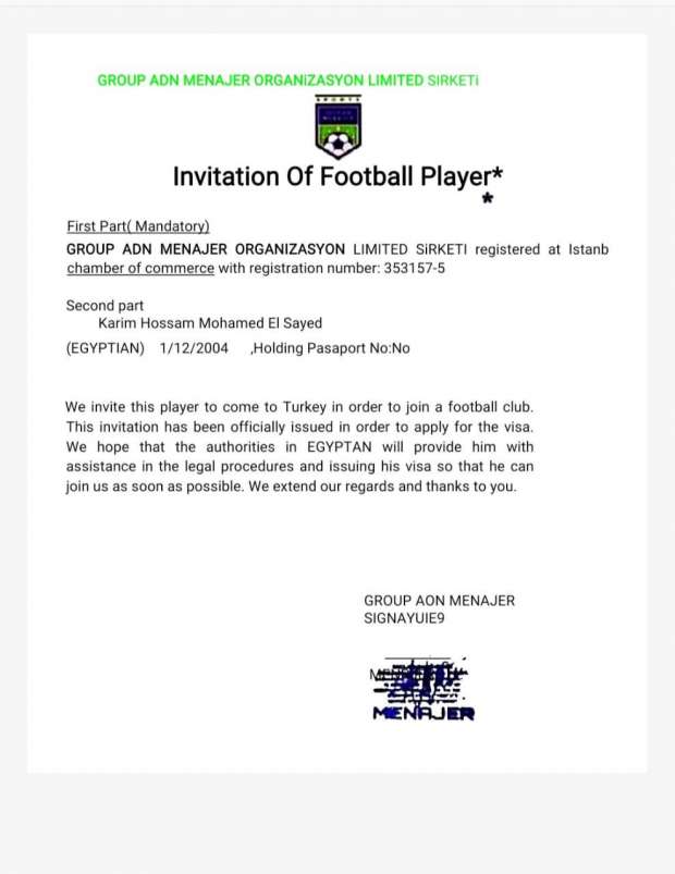 تلقى كريم أرنولد، لاعب فريق النصر القاهري مواليد 2004، خطابا لقضاء فترة معايشة في تركيا، من خلال نادي طرابزون التركي.