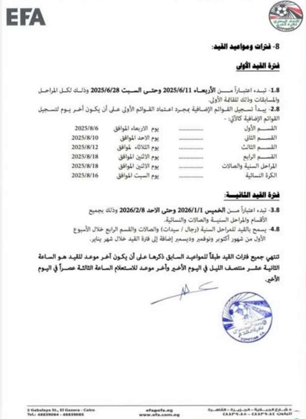 وأكد مصدر داخل النادي في تصريحات خاصة لـ الوطن سبورت: يحق لاي نادي تسجيل المراحل السنية الاقل حتى يوم 18 أغسطس، وفي حال التعذر، يمكن تسجيل اللاعب خلال الأسبوع الأول من أكتوبر أو نوفمبر أو ديسمبر.