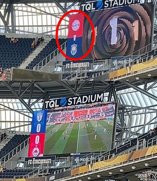وبدأت مباراة باتشوكا المكسيكي ونظيره ريد بول سالزبورج النمساوي على ملعب تي كيو أل، بتواجد شاشة مباراة بايرن ميونيخ الألماني وأوكلاند سيتي النيوزيلندي، التي أجريت على نفس الملعب يوم الأحد الماضي، وأسفلها الشاشة التي تعرض مباراة الفريقين المكسيكي والنمساوي،وفقا لصورة نشرتها قناة إيه إس بي إن الأمريكية الرياضية.