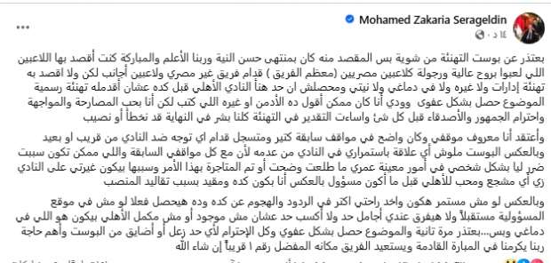 وأكمل: «وبالعكس لو مش مستمر هكون واخد راحتي أكتر في الردود والهجوم عن كده وده هيحصل فعلا لو مش في موقع المسؤولية مستقبلاً ولا هيفرق عندي أجامل حد ولا أكسب حد عشان مش موجود أو مش مكمل الأهلي بيكون هو اللي في دماغي وبس…بعتذر مرة تانية والموضوع حصل بشكل عفوي وكل الإحترام لأي حد زعل أو أضايق من البوست وأهم حاجة ربنا يكرمنا في المبارة القادمة ويستعيد الفريق مكانه المفضل رقم ١ قريباً إن شاء الله».