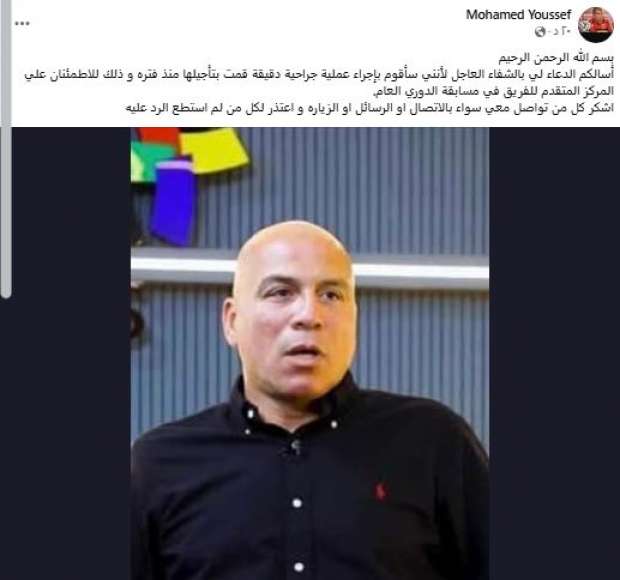 وكتب «يوسف» عبر حسابه الشخصي على موقع التواصل الاجتماعي «فيسبوك»: « أسالكم الدعاء لي بالشفاء العاجل لأنني سأقوم بإجراء عملية جراحية دقيقة قمت بتأجيلها منذ فتره و ذلك للاطمئنان علي المركز المتقدم للفريق في مسابقة الدوري العام».