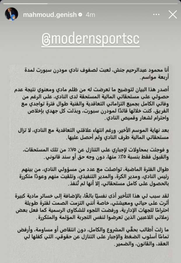 أصدر هذا البيان لتوضيح ما تعرضت له من ظلم مادي ومعنوي نتيجة عدم حصولي على مستحقاتي المالية المستحقة لدى النادي، على الرغم من وفائي الكامل بجميع التزاماتي التعاقدية والفنية طوال فترة تواجدي مع الفريق، كنت خلالها قائدًا لمودرن سبورت، وبذلت كل جهدي بإخلاص واحترام لشعار وقميص النادي.