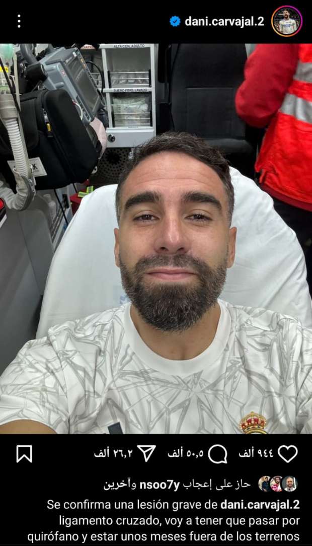 ونشر داني كارفخال، عبر حسابه الرسمي على «إنستجرام»، صورة وعلق عليها: «جرى تأكيد إصابتي الخطيرة بالرباط الصليبي، وسأضطر إلى الخضوع لعملية جراحية وأغيب عن الملعب لبضعة أشهر».