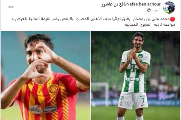 وكتب بن نافع عبر صفحته الرسمية بموقع التواصل الاجتماعي فيس بوك : «محمد علي بن رمضان يغلق نهائيا ملف الاهلي المصري بالرفض رغم القيمة المالية للعرض و موافقة ناديه المجري المبدئية.