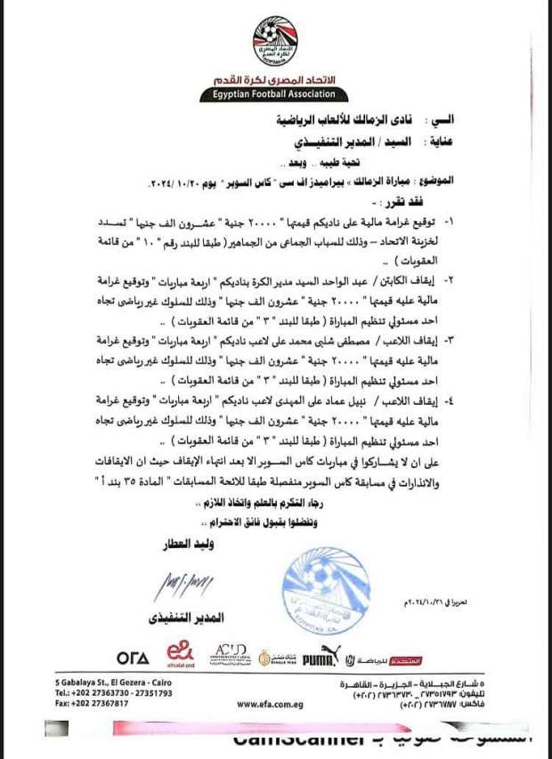 وكتب «الكومي» عبر صفحته على منصة التواصل الاجتماعي «فيسبوك»: «بخصوص عقوبات السوبر بتاريخ 31 أكتوبر 2024، جرى إرسال العقوبات الخاصة بمباراة السوبر لنادي الزمالك، وتضمنت العقوبات التى أقرتها لجنة المسابقات بالاتحاد المصري، الخاصة بالكابتن عبد الواحد السيد ونبيل عماد دونجا ومصطفى شلبي، إلى جانب تغريم نادي الزمالك 20 ألف جنيه».