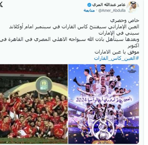 وكتب عامر عبدالله المري، عبر حسابه الرسمي على منصة التواصل الاجتماعي «إكس»: «العين الإماراتي سيفتتح كأس إنتركونتيننتال في سبتمبر أمام أوكلاند سيتي في الإمارات، والفائز سيواجه الأهلي المصري في القاهرة في شهر أكتوبر».