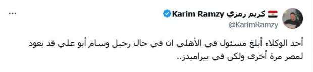 وأكد كريم رمزي في تغريدة له عبر حسابه الرسمي على موقع «إكس» على أن وسام أبو علي قد ينضم لصفوف فريق بيراميدز في المرحلة المقبلة، إذا ما رحل عن النادي الأهلي، قائلا: «أحد الوكلاء أبلغ مسئول في الأهلي أن في حال رحيل وسام أبو علي قد يعود لمصر مرة أخرى ولكن في بيراميدز».