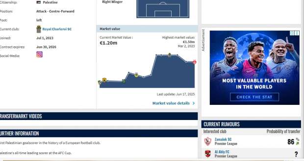 كشف موقع ترانسفير ماركت عن مفاجأة بشأن صراع ناديي الأهلي والزمالك على ضم اللاعب الفلسطيني عدي الدباغ، لاعب فريق شارلروا البلجيكي، خلال فترة الانتقالات الصيفية الجارية.