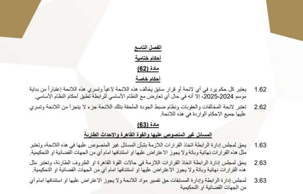 فيما تقول المادة 63 والتي تختص بالمسائل الغير المنصوص عليها والخاصة بالقوة القاهرة والأحداث الطارئة، في البند الأول: «يحق لمجلس إدارة الرابطة اتخاذ القرارات اللازمة بشأن المسائل غير المنصوص عليها في هذه اللائحة وتعتبرمثل هذه القرارات نهائية وباتة ولا يجوز الاعتراض عليها أو استئنافها امام أي من الجهات القضائية أو التحكيمية».