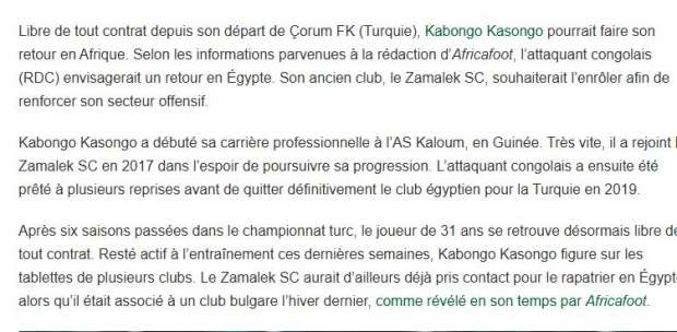 أشار التقرير إلى أن كاسونجو، البالغ من العمر 31 عامًا، بدأ مسيرته الاحترافية مع نادي كالوم الغيني، قبل أن ينتقل إلى الزمالك عام 2017، وخاض عدة تجارب إعارة ثم غادر نهائيًا إلى تركيا عام 2019، حيث قضى 6 مواسم في الدوري التركي.