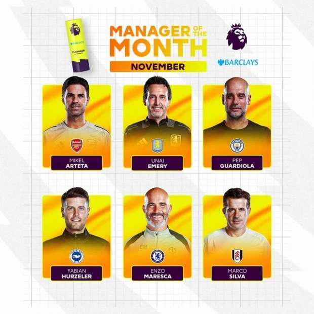 جاءت قائمة المرشحين لجائزة مدرب شهر نوفمبر بالدوري الإنجليزي، على النحو التالي: