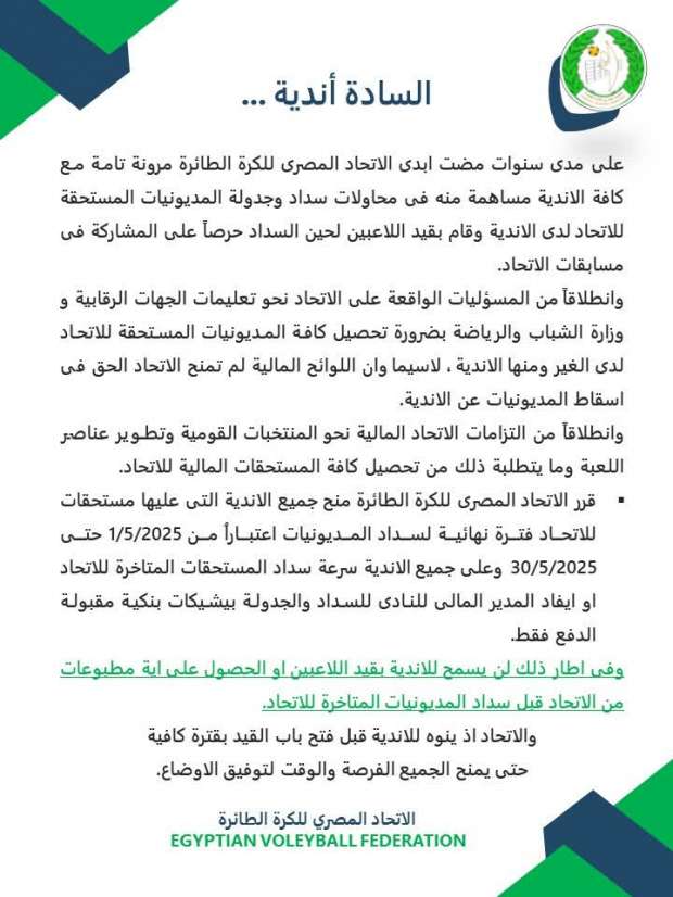 وأوضح اتحاد الطائرة أنه لن يسمح للأندية بقيد اللاعبين أو الحصول على أي مطبوعات من الاتحاد قبل سداد المديونيات المتأخرة للاتحاد.
