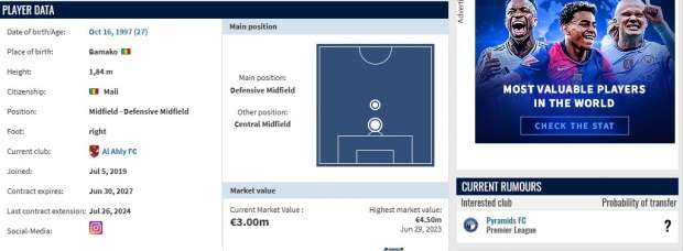 كشف موقع ترانسفير ماركت العالمي المتخصص في انتقالات اللاعبين والمدربين عن مفاجأة من بيراميدز بشأن أليو ديانج، لاعب النادي الأهلي، والذي يبحث مسؤولو القلعة الحمراء عن تجديد عقد اللاعب والذي ينتهي بنهاية الموسم الجديد.