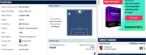 وذكر موقع ترانسفير ماركت حسب التقارير الواردة أن اللاعب السلوفيني أصبح بنسبة 83% قريب للغاية من الانتقال للنادي الأهلي خاصة في ظل التفاوض الذي حدث من جانب مسؤولي القلعة الحمراء والنادي المجري خلال الأيام القليلة الماضية.