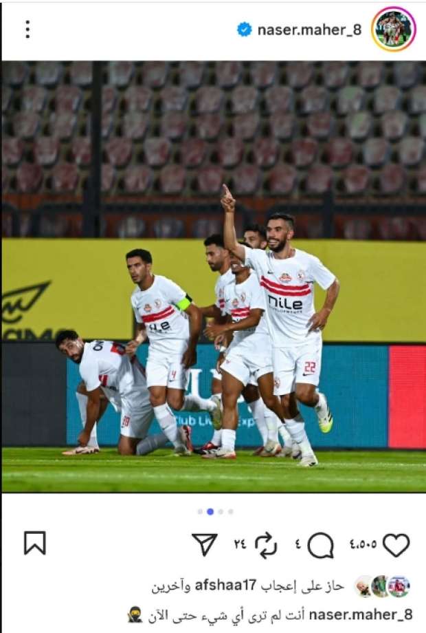 ونشر ناصر ماهر صورة له من احتفاله بالهدف وكتب عبر حسابه بموقع التواصل الاجتماعي إنستجرام: «أنت لم ترى شيئا بعد».