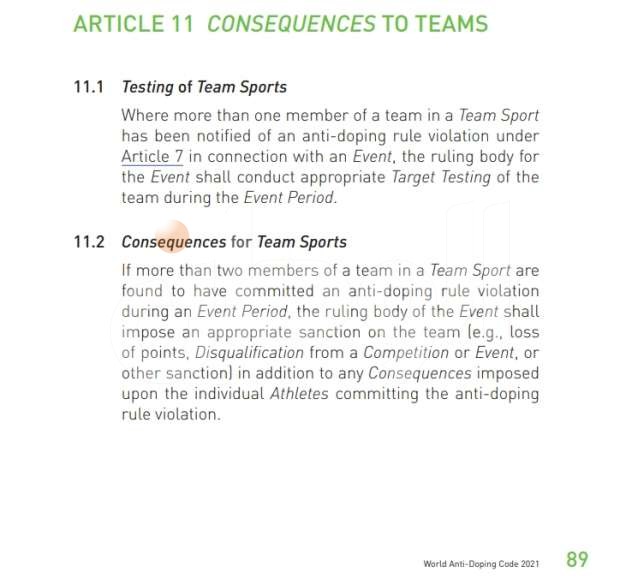 وكشفت المادة 11 من الباب الأول للكود الدولي عن حالة وحيد لمعاقبة النادي، وذلك في البند الأول أنه في حالة وجود أكثر من عضو بالفريق للرياضات الجماعية انتهك قواعد مكافحجة المنشطات فإنه بموجب المادة 7 فيما يتعلق بما حدث سيتم إجراء اختبارات للاعبين.