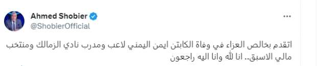 وكتب شوبير، عبر حسابه الشخصي على موقع التواصل الاجتماعي «تويتر»: «أتقدم بخالص العزاء في وفاة الكابتن أيمن اليمني لاعب ومدرب نادي الزمالك ومنتخب مالي الأسبق.. انا لله وانا اليه راجعون