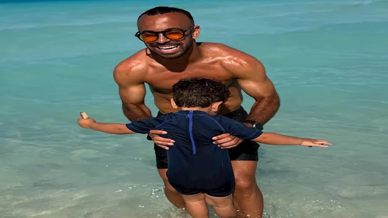 ورافقه في الصور ابنه أثناء استمتاعهم بالإجازة، حيث ظهر في إحدى اللقطات وهو يحتضن ابنه الصغير في لحظة عائلية ومميزة.
