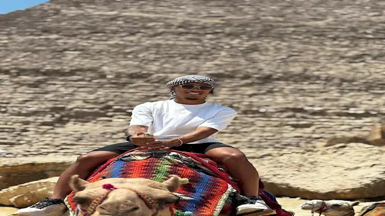 ونشر ألفينا صور له مع زوجته من أمام الأهرامات وأخرى مع الجمل، حيث ظهر وهو يحتفل بـ “القوس والسهم”.